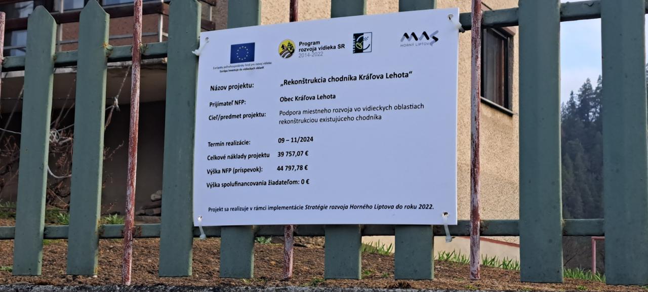 Obci Kráľova Lehota bola Pôdohospodárskou platobnou agentúrou (PPA) Bratislava schválená Žiadosť o finančný príspevok na projekt „Rekonštrukcia chodníka Kráľova Lehota“ vo výške 44 797,78 €. So stavebnými prácami sme začali 17. septembra 2024. Celková dĺžka rekonštrukcie chodníka je 271,10 m a šírka chodníka je 1,5 m. Stavebné práce pozostávali z odstránenia pôvodného asfaltového krytu a čiastočne aj zámkovej dlažby, ktoré tvorili povrch pôvodného chodníka. Spevnilo sa podložie pod zámkovú dlažbu chodníka a vjazdov k rodinným domom. Následne sa položila zámková dlažba a vybudovali sa nové vjazdy k rodinným domom. Chodník je doplnený aj dlažbou pre nevidiacich chodcov. Stavebné práce boli ukončené a dielo bolo obci odovzdané 19. novembra 2024. Celkové náklady na rekonštrukciu chodníka boli vo výške 39 797,09 €. Finančný rozdiel bude použitý na nákup a osadenie lavičiek, mobiliáru a vysadia sa dreviny a zeleň v záhrade materskej školy.